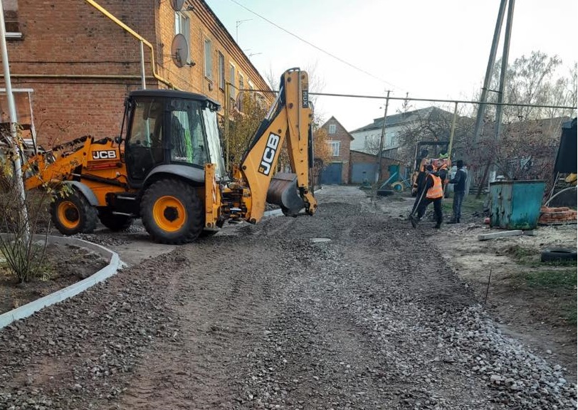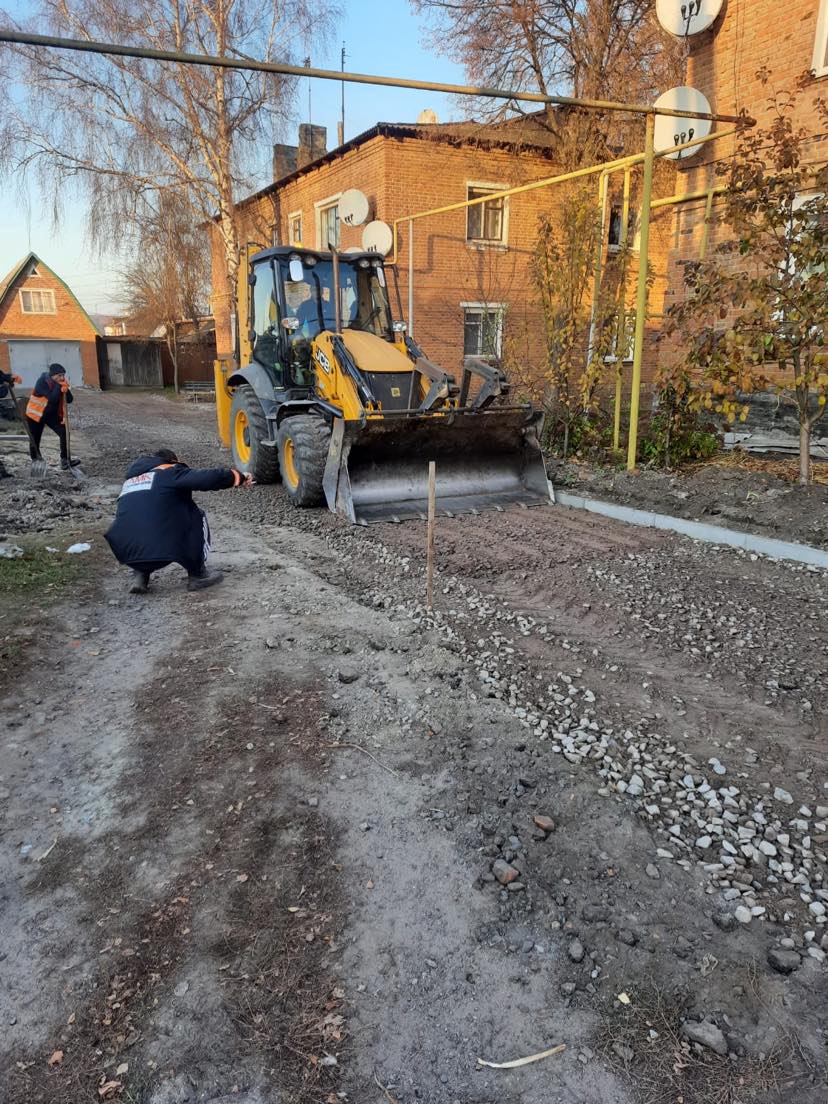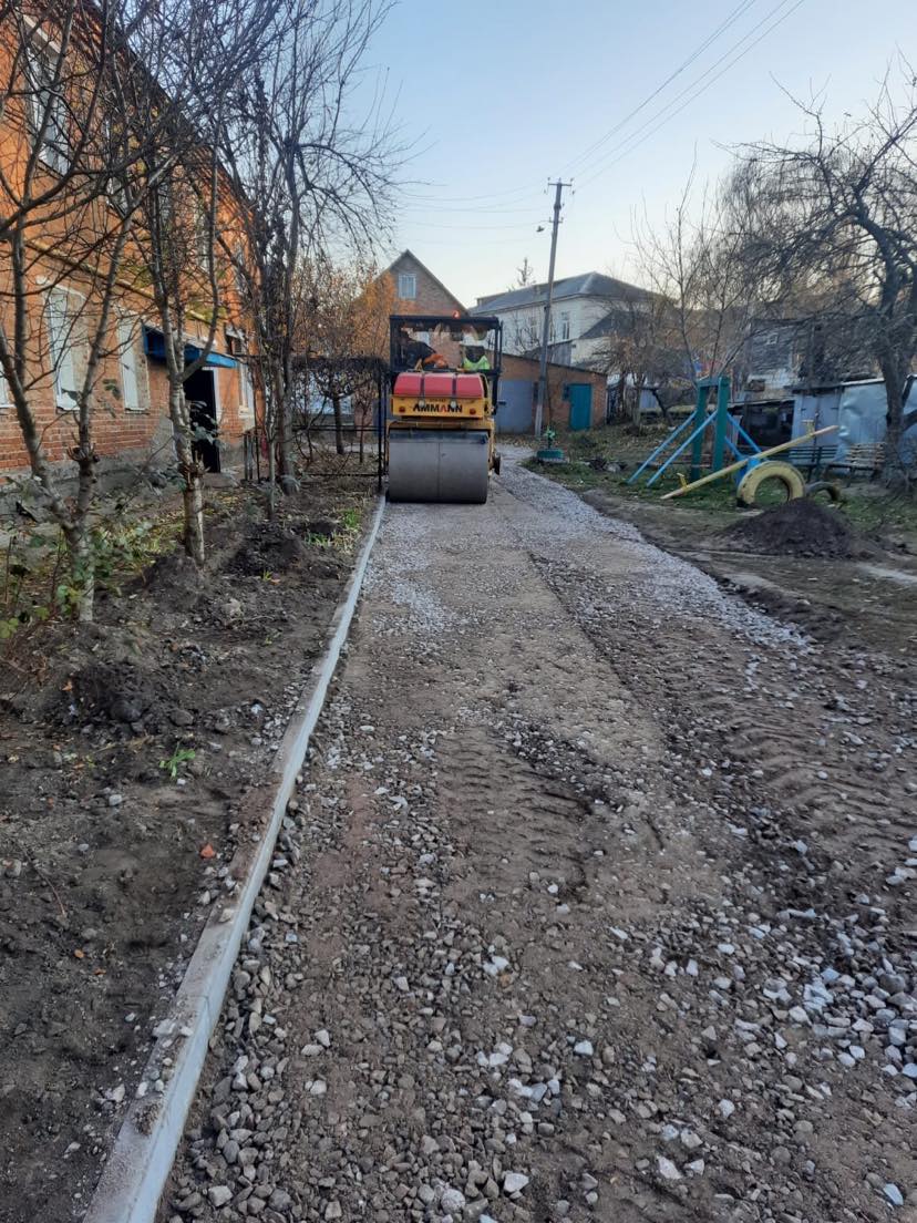 Так, на сьогоднішній день на об’єкті працівники компанії вже встановили нові поребрики та розпочали укладати вирівнюючий шар із щебеневі-піщаної суміші.