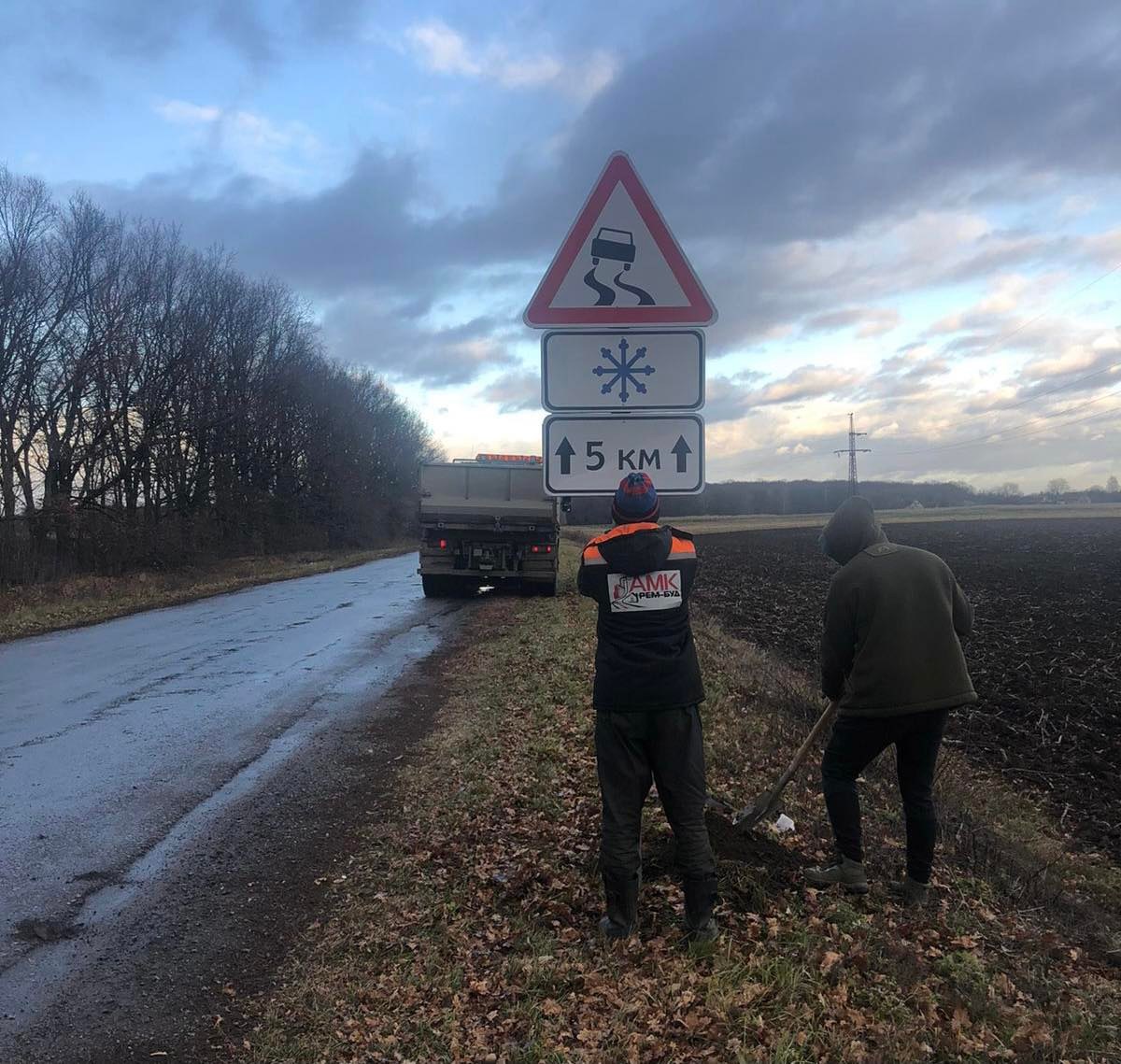 Осінньо-зимовий період – не час для відпочинку працівників «АМК РЕМ-БУД». Так, бригади компанії продовжують реалізовувати низку заходів у рамках експлуатаційного утримання доріг Сумщини. Серед них – встановлення на складних ділянках автошляхів тимчасових комплектів «зимових» дорожніх знаків: «Слизька дорога», «Ожеледиця», «Зона дії».