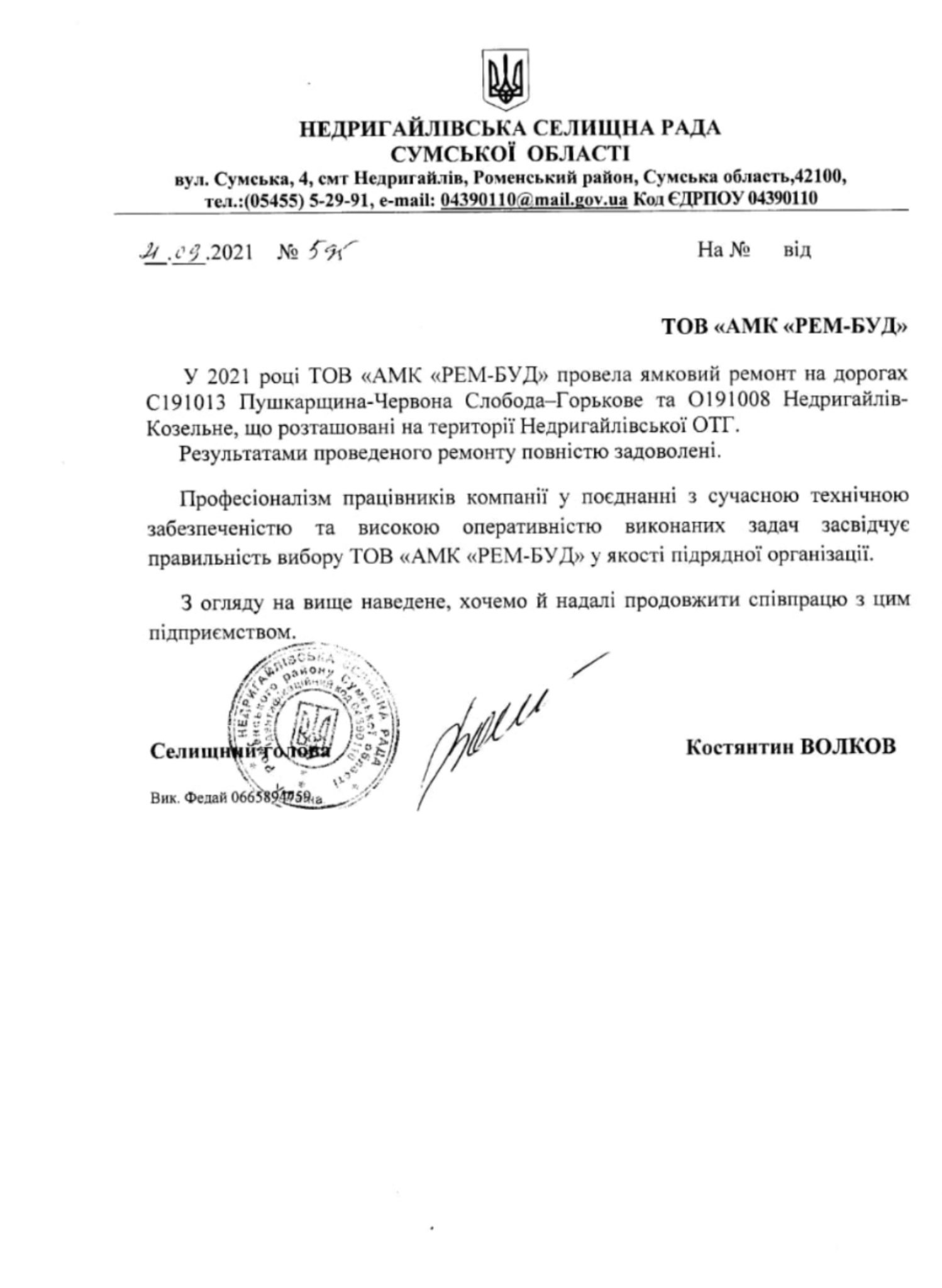 «Професіоналізм працівників компанії у поєднанні з сучасною технічною забезпеченістю та високою оперативністю виконаних задач засвідчує правильність вибору ТОВ «АМК «РЕМ-БУД» у якості підрядної організації. З огляду на вище наведене, хочемо й надалі продовжити співпрацю з цим підприємством», – йдеться у відгуці за підписом селищного голови Недригайлова Костянтина Волкова.